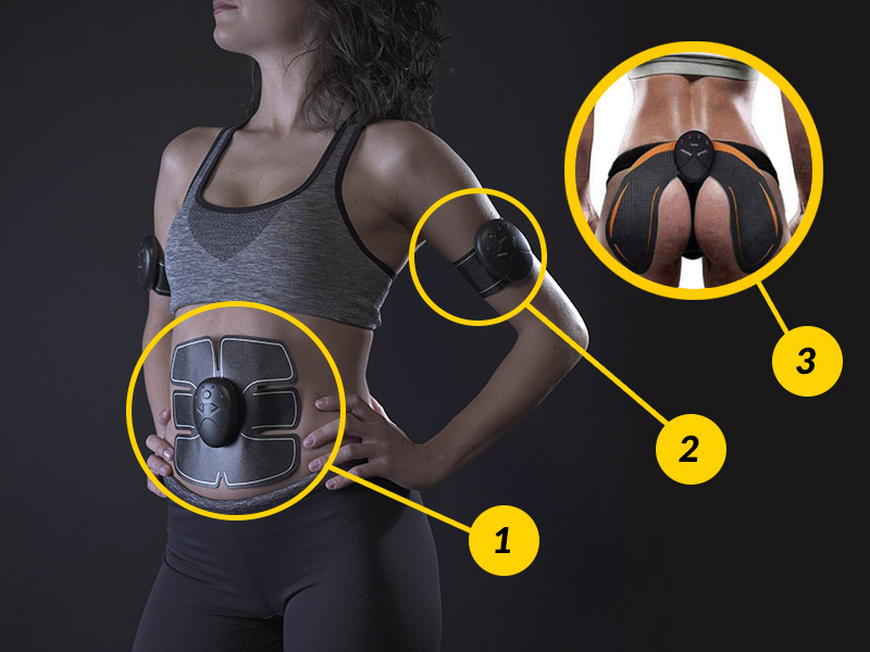 ELETTROSTIM agisce sulla zona addominale applicando il PAD a 6 alette sulla pancia (1), su braccia e cosce applicando le alette singole (2), sui glutei applicando il PAD apposito (3) per ottenere glutei alti e sodi.